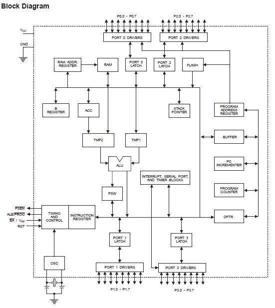 Features:(1)Compatible with MCS-51 Products; (2)8K Bytes of In-System Reprogrammable Flash Memory Endurance: 1,000 Write/Erase Cycles; (3)Fully Static Operation: 0 Hz to 24 MHz; (4)Three-Level Program Memory Lock; (5)256 x 8-Bit Internal RAM; (6)32 Programmable I/O Lines; (7)Three 16-Bit Timer/Counters; (8)Eight Interrupt Sources; (9)Programmable Serial Channel; (10)Low Power Idle and Power Down Modes.