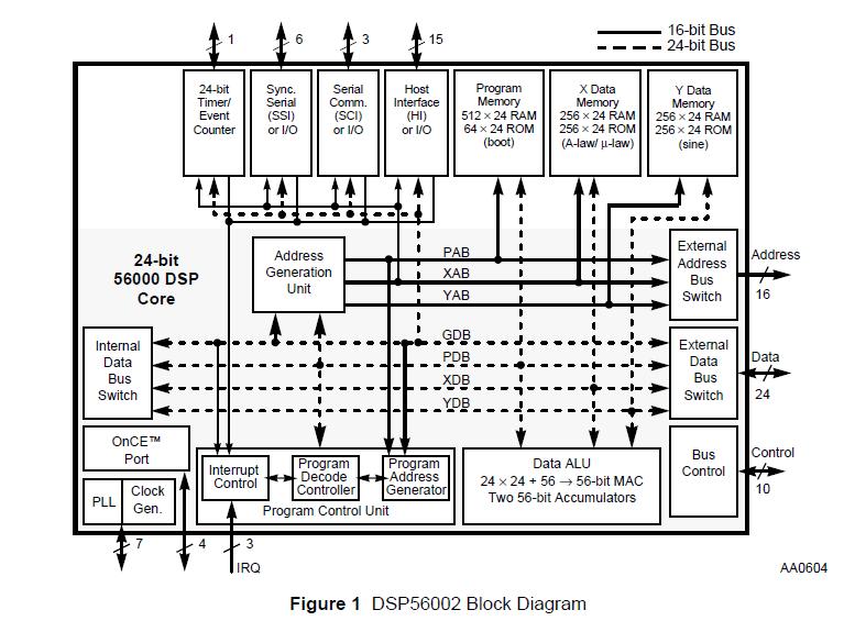 The DSP56002FC40 is a MPU-style general purpose Digital Signal Processor (DSP) composed of an efficient 24-bit DSP core, program and data memories, various peripherals, and support circuitry. The DSP56002FC40 core is fed by on-chip Program RAM, and two independent data RAMs. The device contains a Serial Communication Interface (SCI), Synchronous Serial Interface (SSI), parallel Host Interface (HI), Timer/Event Counter, Phase Lock Loop (PLL), and an On-Chip Emulation (OnCE) port. This combination of features makes the DSP56002FC40 a cost-effective, high-performance solution for high-precision general purpose digital signal processing.