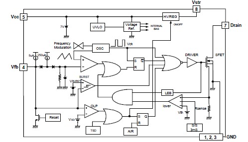 The FSD200 is integrated Pulse Width Modulator (PWM) which is specially designed for high performance off-line Switch Mode Power Supplies (SMPS) with minimal external components. When compared to a discrete MOSFET and controller or RCC switching converter solution, the FSD200 reduces total component count, design size, weight and at the same time increase efficiency, productivity, and system reliability. The FSD200 is suitable for auxiliary power for White Goods, PC, C-TV and monitor.