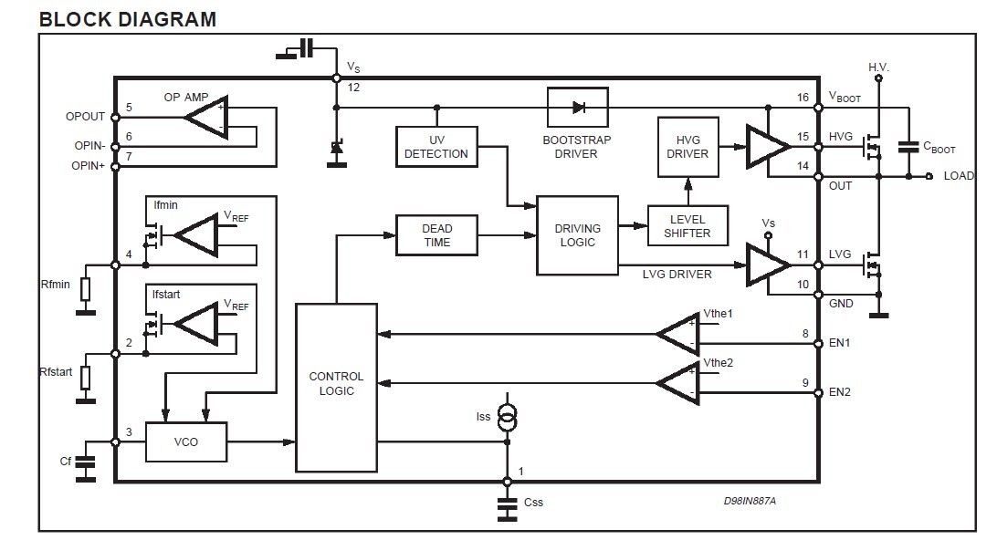 L6598 features: (1)HIGH VOLTAGE RAIL UP TO 600V; (2)dV/dt IMMUNITY±50V/ns IN FULL TEMPERATURE RANGE; (3)DRIVER CURRENT CAPABILITY: 250mA SOURCE; 450mA SINK; (4)SWITCHING TIMES 80/40ns RISE/FALL WITH 1nF LOAD; (5)CMOS SHUT DOWN INPUT; (6)UNDER VOLTAGE LOCK OUT; (7)SOFT START FREQUENCY SHIFTING TIMING; (8)SENSE OP AMP FOR CLOSED LOOP CONTROL OR PROTECTION FEATURES; (9)HIGH ACCURACY CURRENT CONTROLLED OSCILLATOR; (10)INTEGRATED BOOTSTRAP DIODE; (11)CLAMPING ON Vs; (12)SO16, DIP16 PACKAGES.