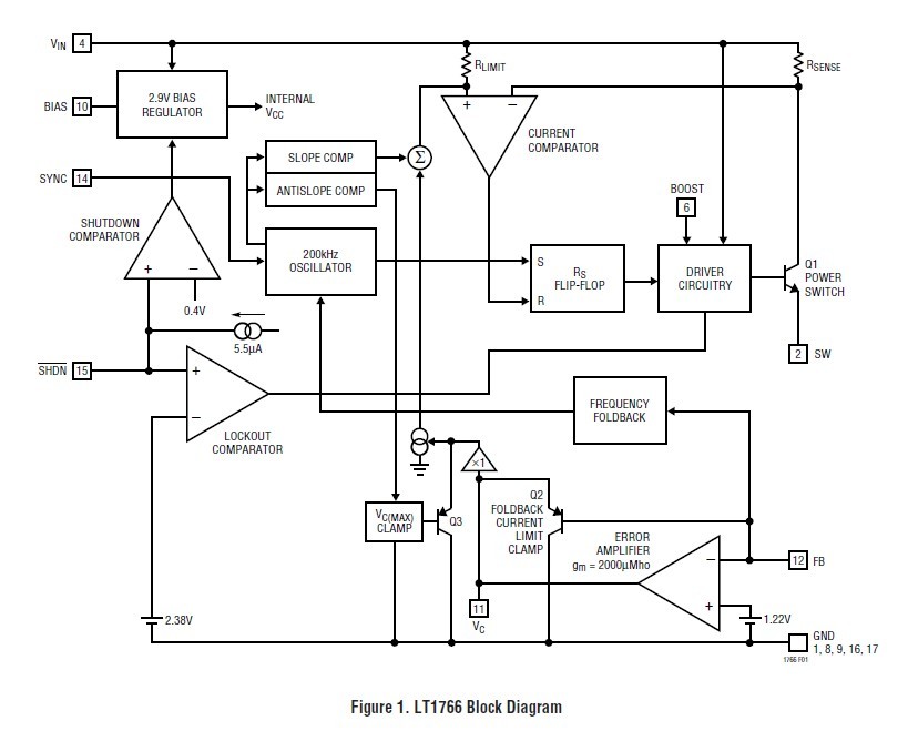 LT1766EFE features: (1)Wide Input Range: 5.5V to 60V; (2)1.5A Peak Switch Current; (3)Constant 200kHz Switching Frequency; (4)Saturating Switch Design: 0.2Ω; (5)Peak Switch Current Rating Maintained Over Full Duty Cycle Range; (6)Low Effective Supply Current: 2.5mA; (7)Low Shutdown Current: 25μA; (8)1.2V Feedback Reference Voltage; (9)5V Fixed Output; (10)Easily Synchronizable; (11)Cycle-by-Cycle Current Limiting; (12)Small 16-Pin SSOP and Thermally Enhanced TSSOP Packages.