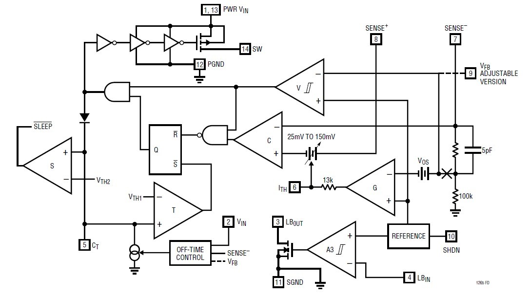 LTC1265CS features: (1)High Efficiency: Up to 95%; (2)n Current Mode Operation for Excellent Line and Load Transient Response; (3)Internal 0.3Ω Power Switch (VIN = 10V); (4)Short-Circuit Protection; (5)Low Dropout Operation: 100% Duty Cycle; (6)Low-Battery Detector; (7)Low 160mA Standby Current at Light Loads; (8)Active-High Micropower Shutdown: IQ < 15mA; (9)Peak Inductor Current Independent of Inductor Value; (10)Available in 14-pin SO Package.