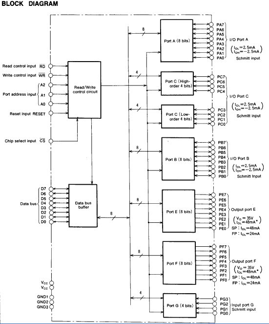 The M66500SP is a large-scale integrated circuit chip for programmable high-speed I/O interface, manufactured using a Bi-CMOS process and is suitable for 8-and 16-bit high speed CPU I/O ports. The device M66500SP is operated by a single 5V power supply and consists of three sets of 8-bit I/O ports, two sets of 8-bit high-withstand voltage output-only ports, and one 4-bit input-only port.