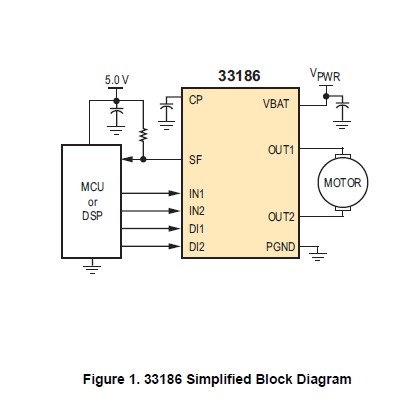 The MC33186DH is a monolithic H-Bridge ideal for fractional horsepower DC-motor and bi-directional thrust solenoid control. The IC incorporates internal control logic, charge pump, gate drive, and low RDS(ON) MOSFET output circuitry. The MC33186DH is able to control continuous inductive DC load currents up to 5.0 A. Output loads can be pulse width modulated (PWM-ed) at frequencies up to 10 kHz.