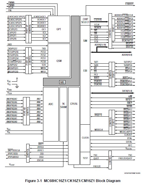 The MC68HC16Z1CFC16 is a high-speed 16-bit control unit that is upwardly code compatible with M68HC11 controllers. It incorporates a true 16-bit central processing unit (CPU16), a system integration module (SIM), an 8/10-bit analog-to-digital converter (ADC), a queued serial module (QSM), a generalpurpose timer (GPT), and a 2048-byte standby RAM (SRAM). These modules are interconnected by the intermodule bus (IMB).