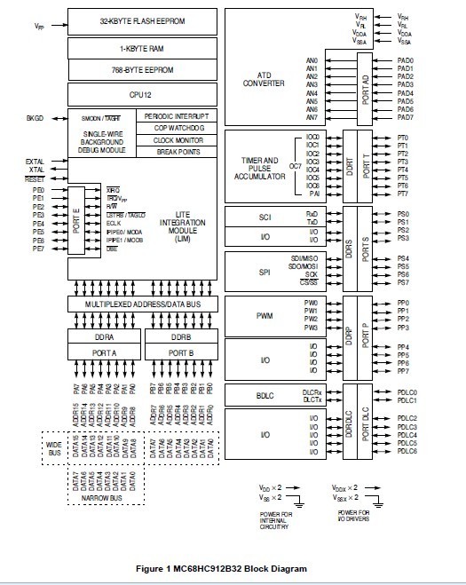 The MC68HC912B32CFUE8 microcontroller unit (MCU) is a 16-bit device composed of standard on-chip peripherals including a 16-bit central processing unit (CPU12), 32-Kbyte flash EEPROM, 1-Kbyte RAM, 768-byte EEPROM, an asynchronous serial communications interface (SCI), a serial peripheral interface(SPI), an 8-channel timer and 16-bit pulse accumulator, an 8-bit analog-to-digital converter (ADC), a four-channel pulse-width modulator (PWM), and a J1850-compatible byte data link communications module (BDLC). The MC68HC912B32CFUE8 is the first 16-bit microcontroller to include both byte-erasable EEPROM and flash EEPROM on the same device.