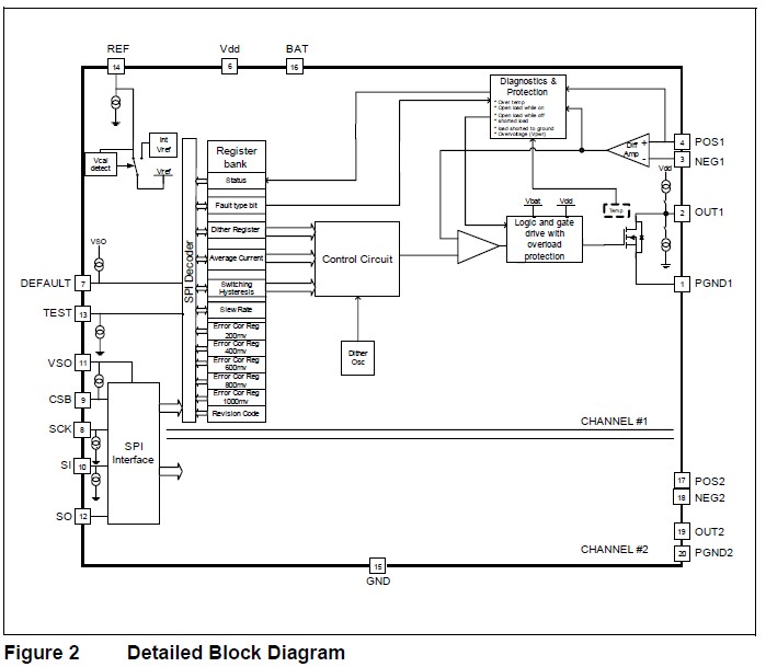 Features: (1)Two Fully Independent Channels; (2)Integrated N-channel DMOS transistors; (3)Programmable Average Current with 10-bit resolution via SPI: Iavg range = 0 to 1000 mA (typical); (4)Programmable Superimposed Dither; (5)Interface and Control; (6)Protection: Overcurrent, Overvoltage, overtemperature; (7)Diagnostics: Overcurrent / shorted solenoid, overtemperature, Open load, Short to GND; (8)Green Product (RoHS compliant); (9)AEC Qualified.