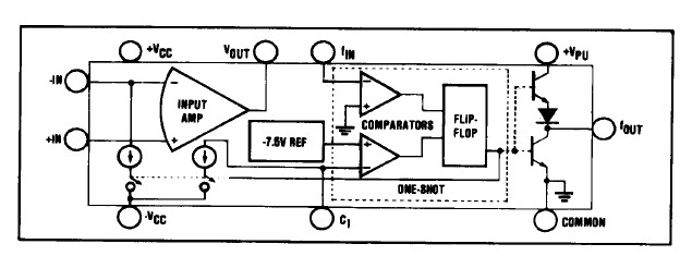 Absolute maximum ratings: (1)Supply Voltage: ±20V; (2)Output Sink Current (FOUT): 50mA; (3)Output Current (VOUT): +20mA; (4)Input Voltage, –Input: ±VCC; (5)Input Voltage, +Input: ±VCC; (6)Storage Temperature Range:: –65℃ to +150℃; (7)lead temperature(soldering, 10 seconds): +300℃.